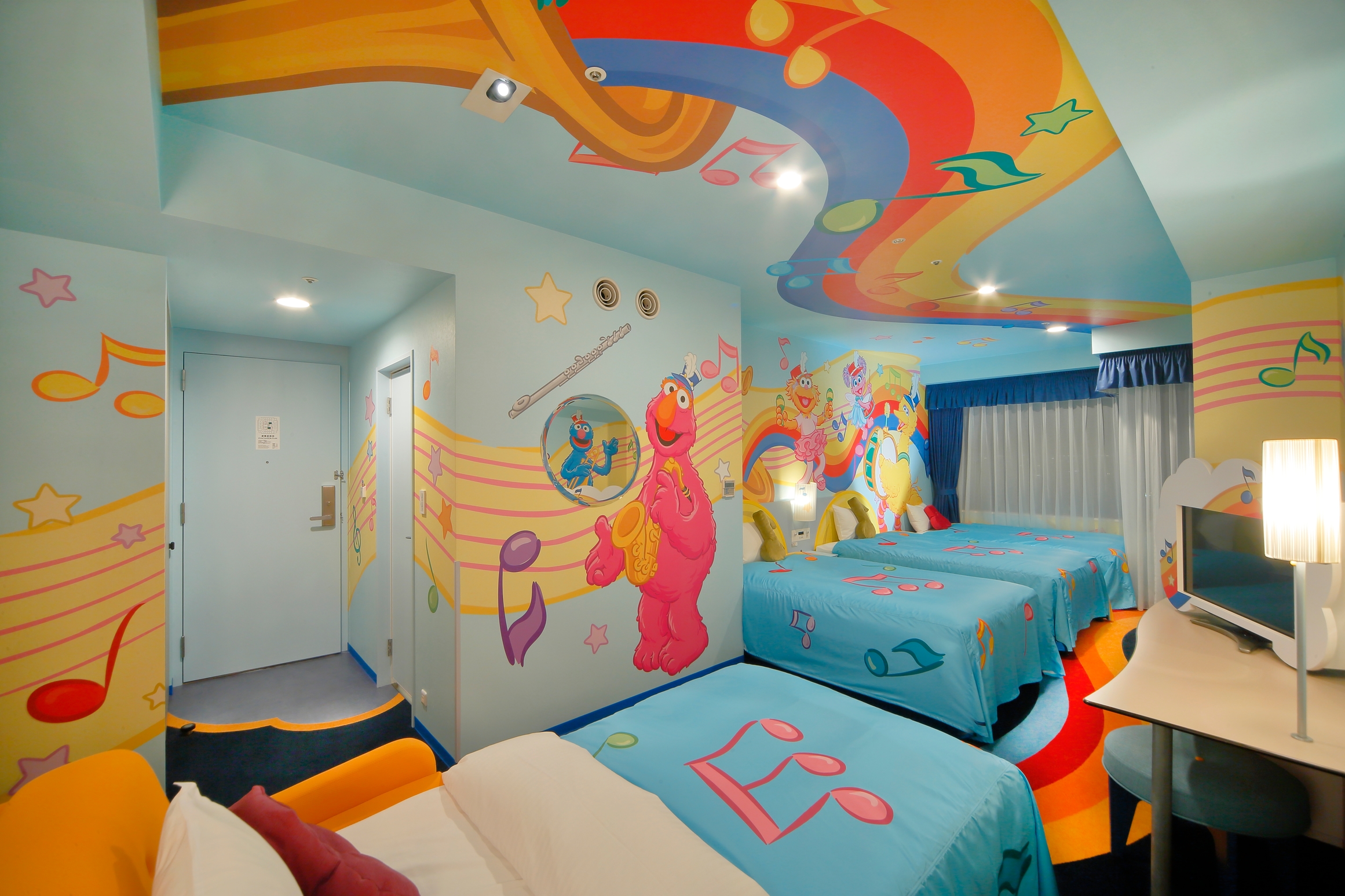 2025年6月時点では、USJを代表するセサミストリートとコラボしたエルモのハッピールームが人気です。壁紙、ベッドカバー、カーテン、クッションに至るまで、部屋全体が世界観に染まっているので、まるでテーマパークの中で一晩過ごすような感覚です。